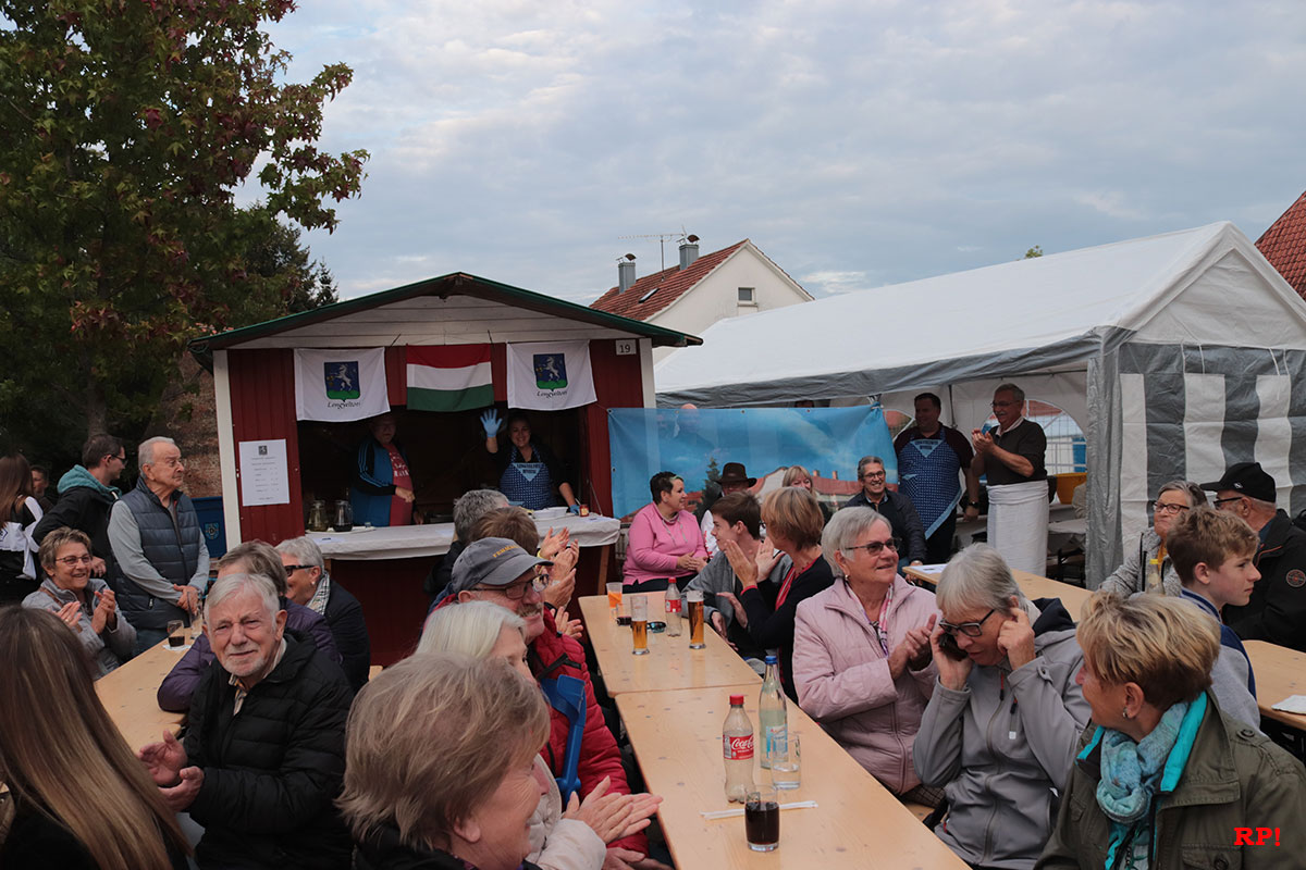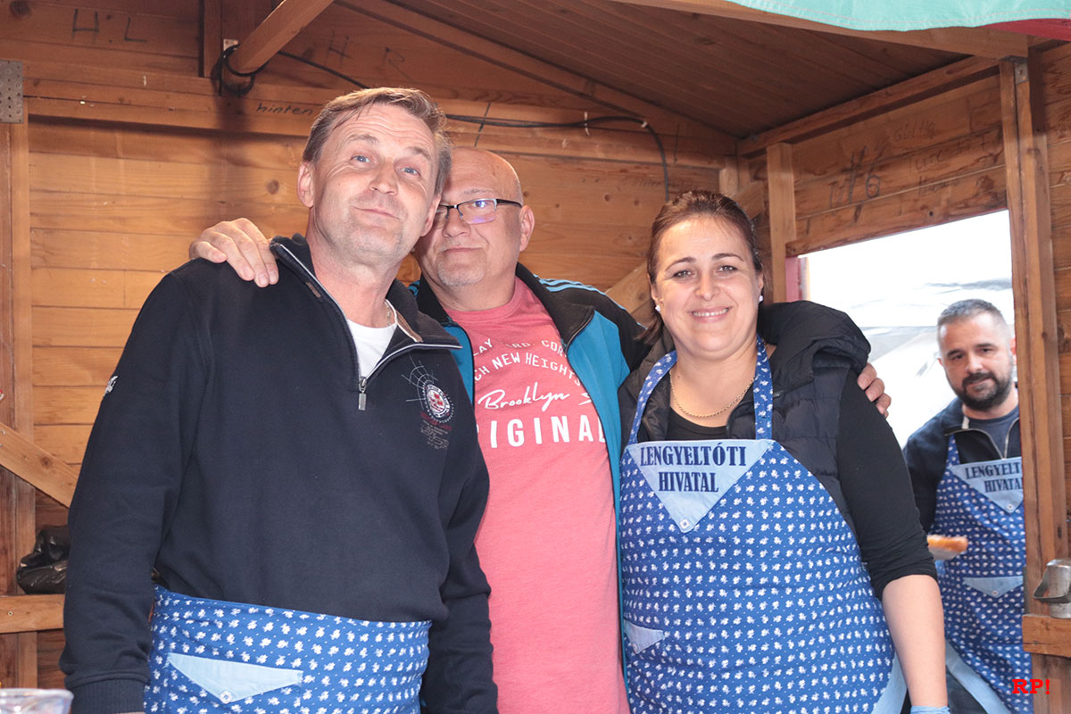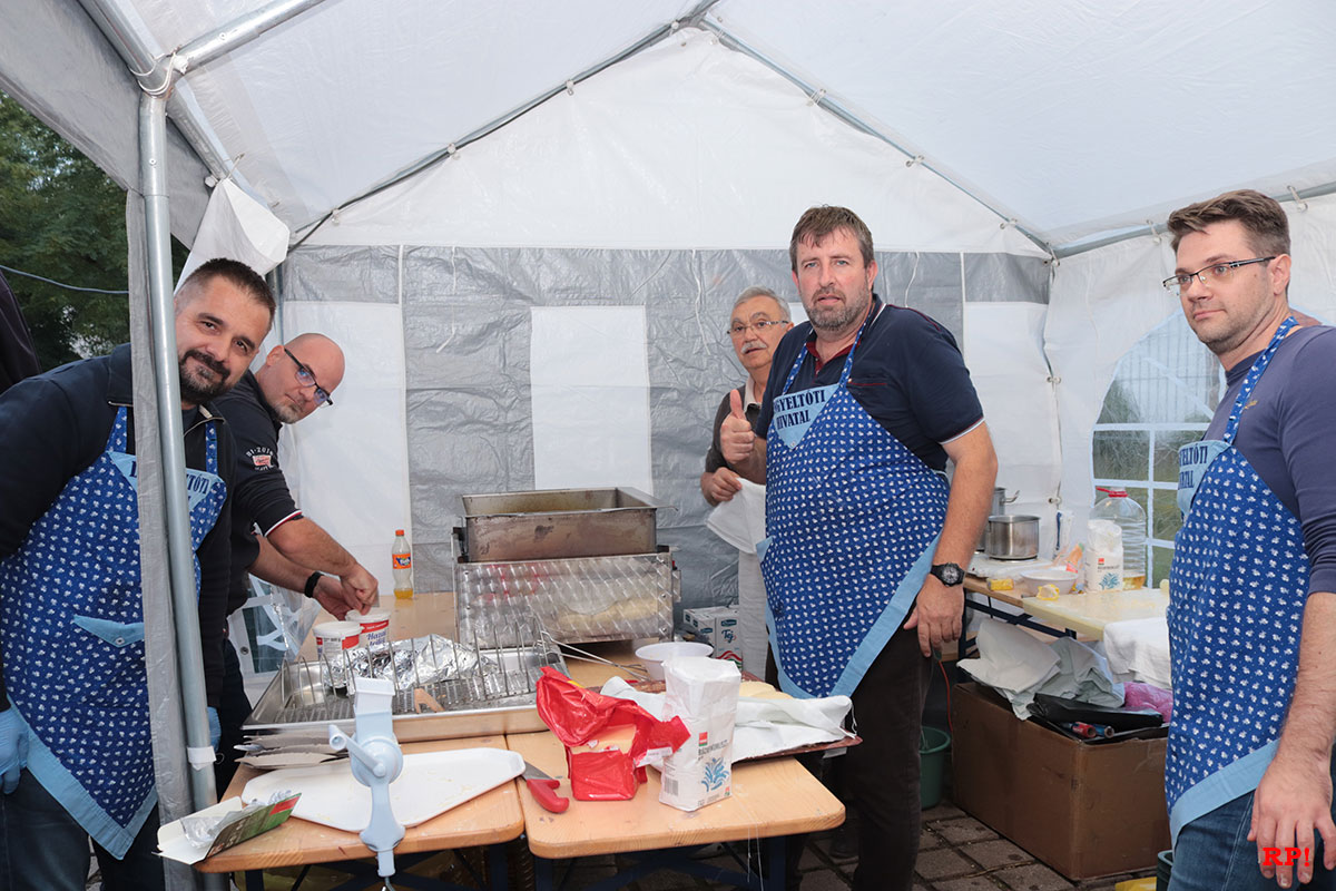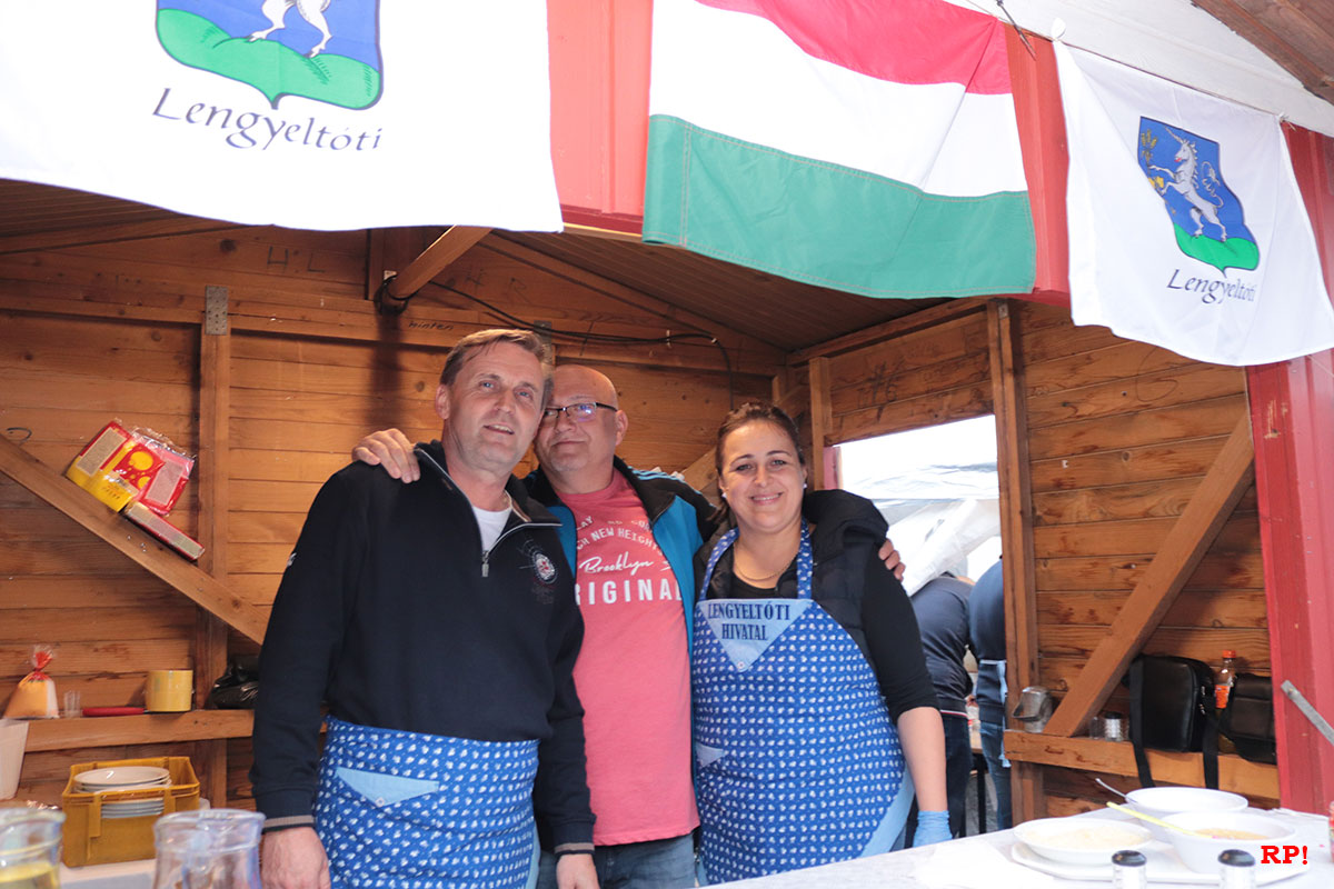 Auch original ungarisches Essen wird geboten. Original auch, weil es Ungarn aus Dielheims ungarischer Partnerstadt Lengyeltóti zubereiten. Lengyeltóti ist rund 20 km südlich des Plattensees (auf Ungarisch Balaton) gelegen, das bedeutet, die 10 Ungarn sind fast 1000 Kilometer angereist, um an der Dielheimer Kerwe teilzunehmen.