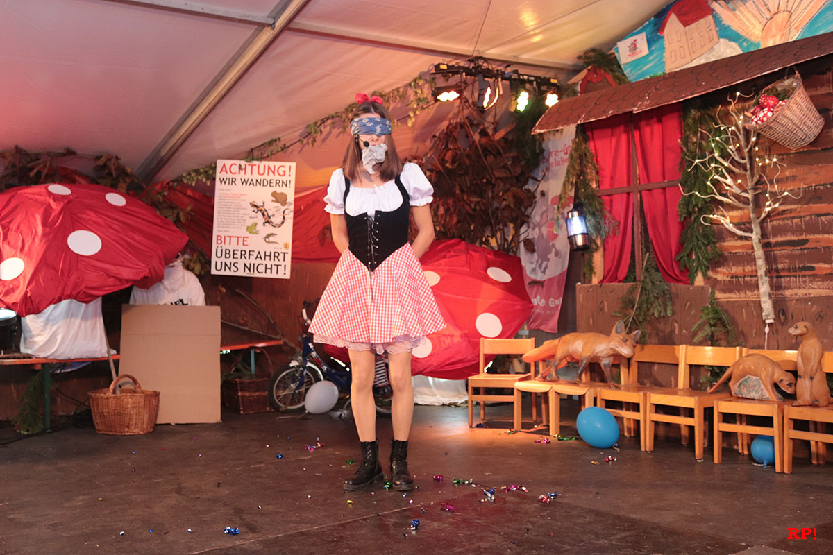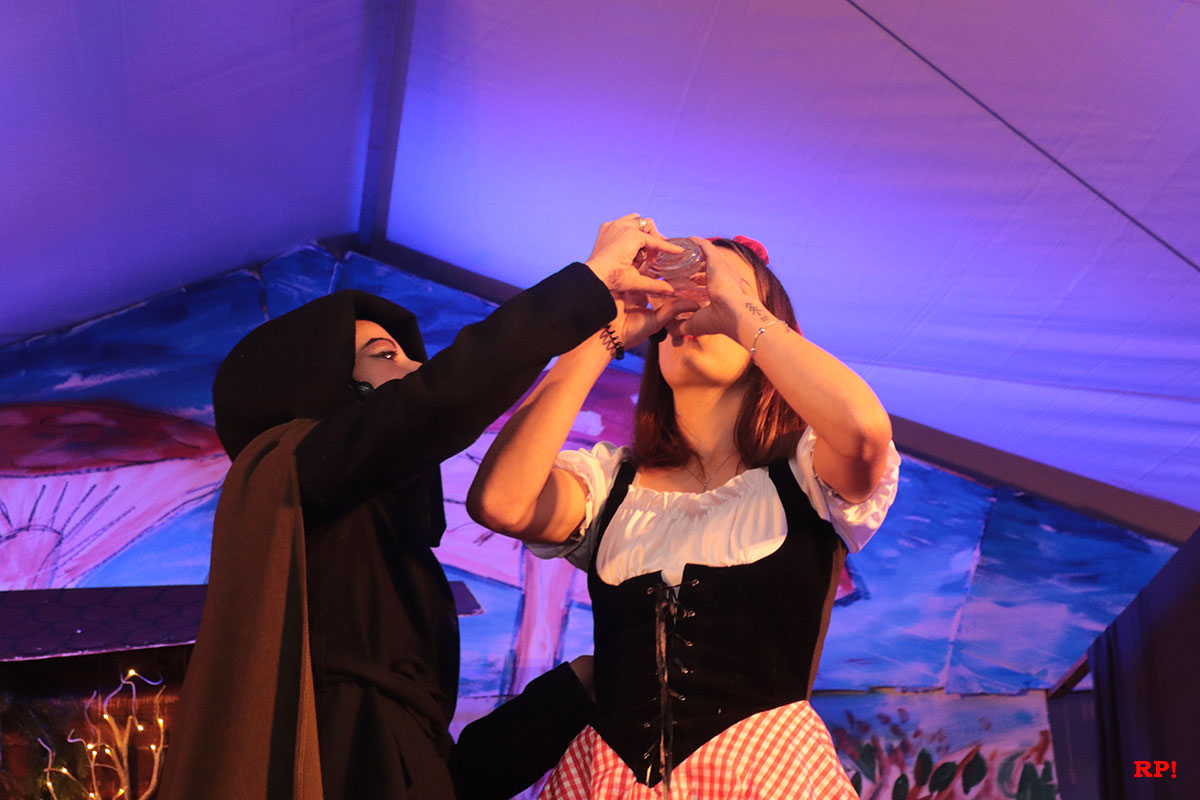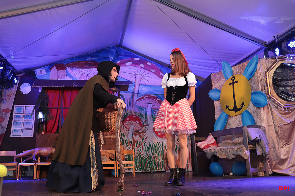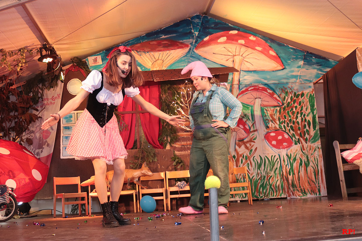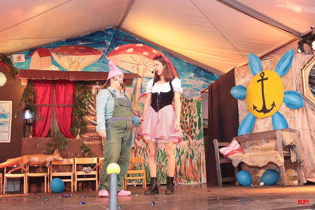 Doch der Reihe nach. Als Erster bemerkte es „SZ“, der Sing-Zwerg (Hubert Schröder): Jemand hatte beim örtlichen Schnapsbrenner den Williams-Christ entwendet. „Aber wer?“ fragte auch das zahlreiche Publikum. Auf den ersten Blick keine schlimme Sache – offensichtlich waren echte Feinschmecker am Werk gewesen. Dann aber traf Schneewittchen (Ayana Schmidt), die schöne Schatthäuser Tochter von König Lutz, beim Golfbällesammeln eine höchst freundliche Dame in besten Jahren, die sich als „Ursel“ vorstellte und ihr etwas Köstliches anbot. Keinen Apfel, wie Schneewittchen insgeheim gehofft hatte, sondern ein durchsichtiges Getränk, welches nach leckeren Birnen duftete. Das Mädchen wollte der guten Frau nichts abschlagen und trank gleich – höflich wie sie war – einen halben Liter „auf ex“.