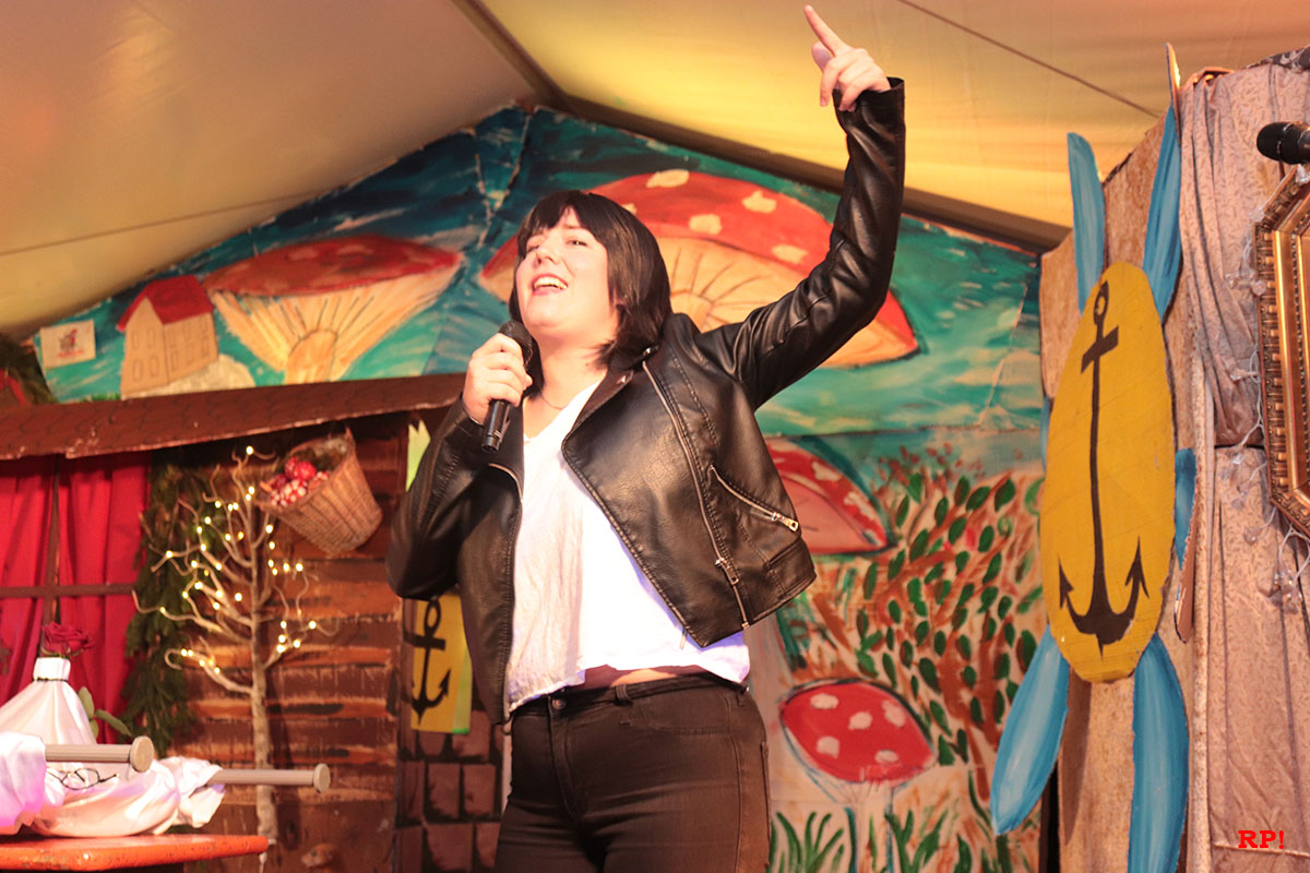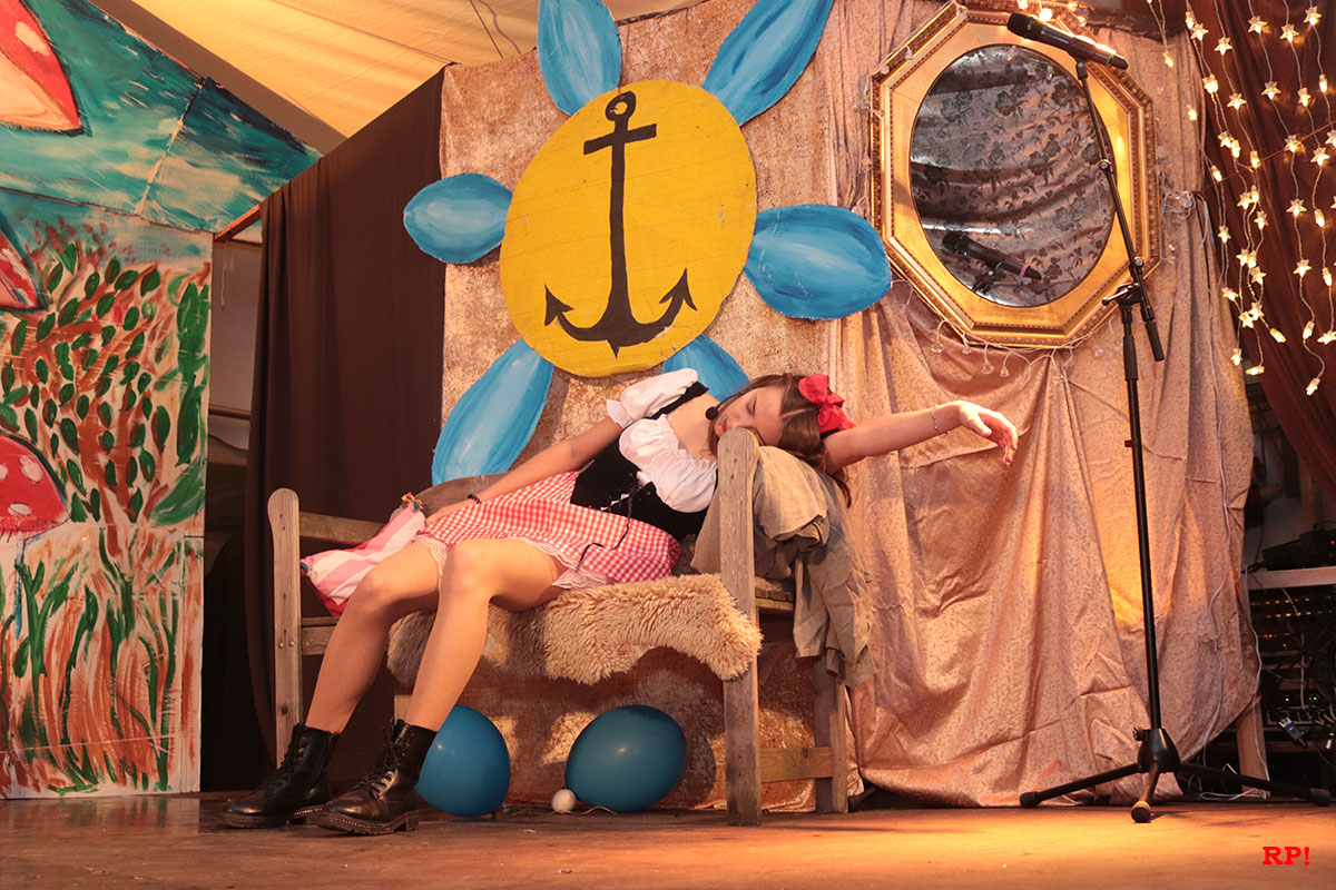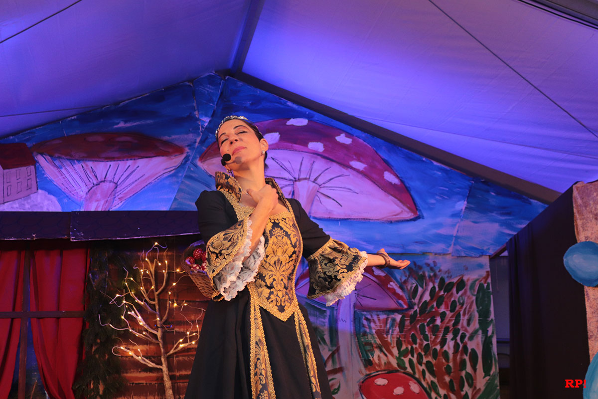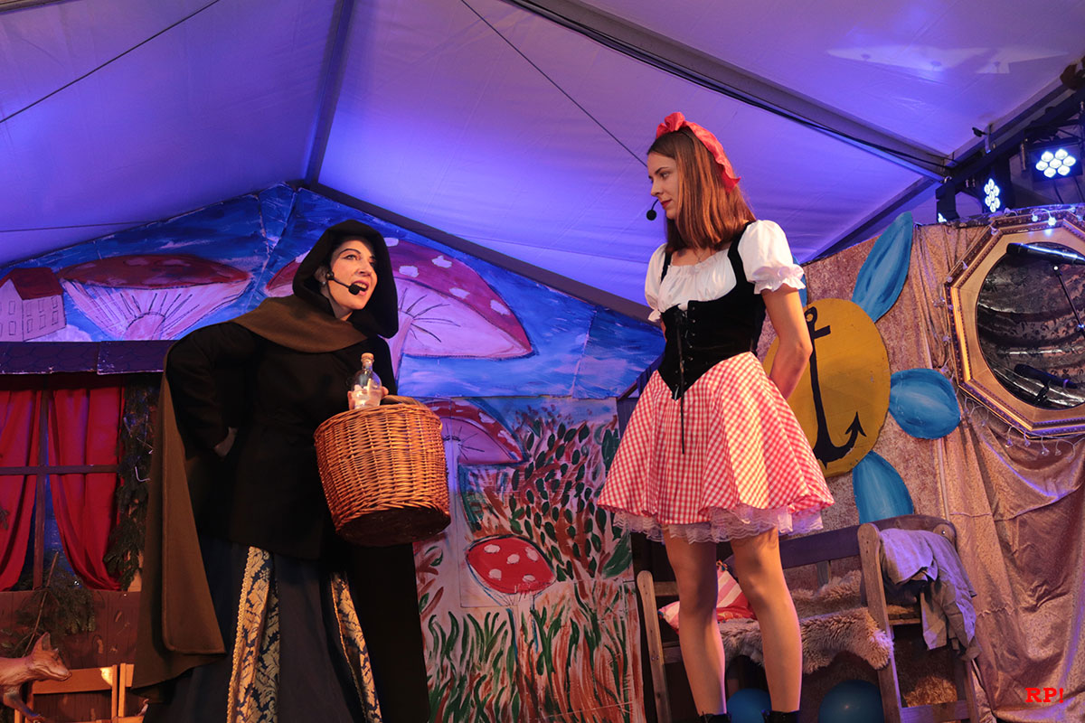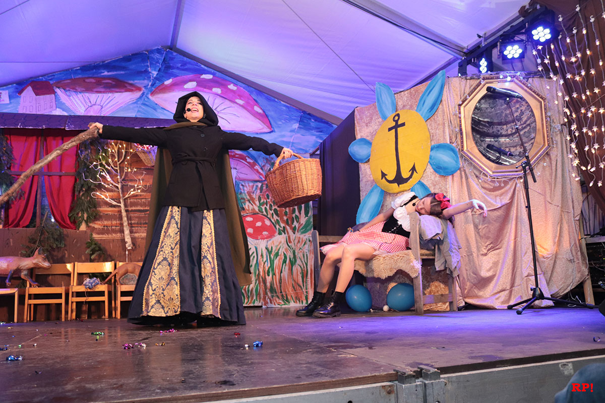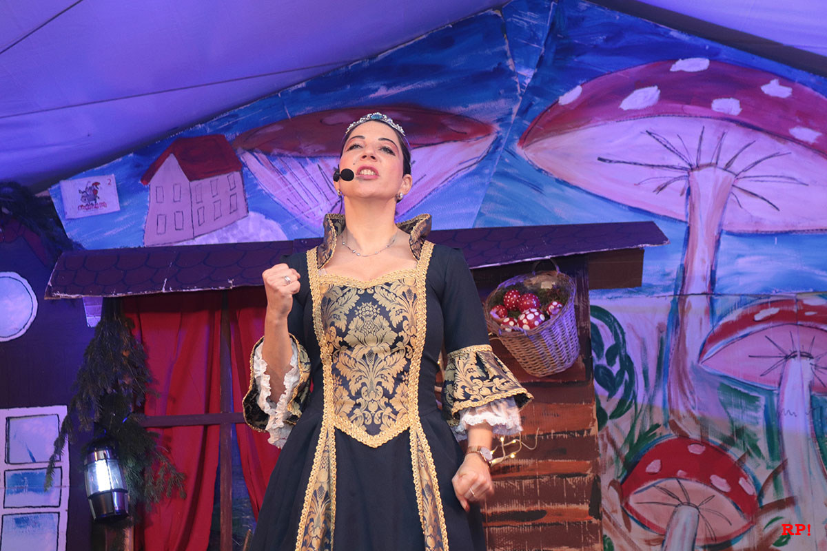 Doch der Reihe nach. Als Erster bemerkte es „SZ“, der Sing-Zwerg (Hubert Schröder): Jemand hatte beim örtlichen Schnapsbrenner den Williams-Christ entwendet. „Aber wer?“ fragte auch das zahlreiche Publikum. Auf den ersten Blick keine schlimme Sache – offensichtlich waren echte Feinschmecker am Werk gewesen. Dann aber traf Schneewittchen (Ayana Schmidt), die schöne Schatthäuser Tochter von König Lutz, beim Golfbällesammeln eine höchst freundliche Dame in besten Jahren, die sich als „Ursel“ vorstellte und ihr etwas Köstliches anbot. Keinen Apfel, wie Schneewittchen insgeheim gehofft hatte, sondern ein durchsichtiges Getränk, welches nach leckeren Birnen duftete. Das Mädchen wollte der guten Frau nichts abschlagen und trank gleich – höflich wie sie war – einen halben Liter „auf ex“.