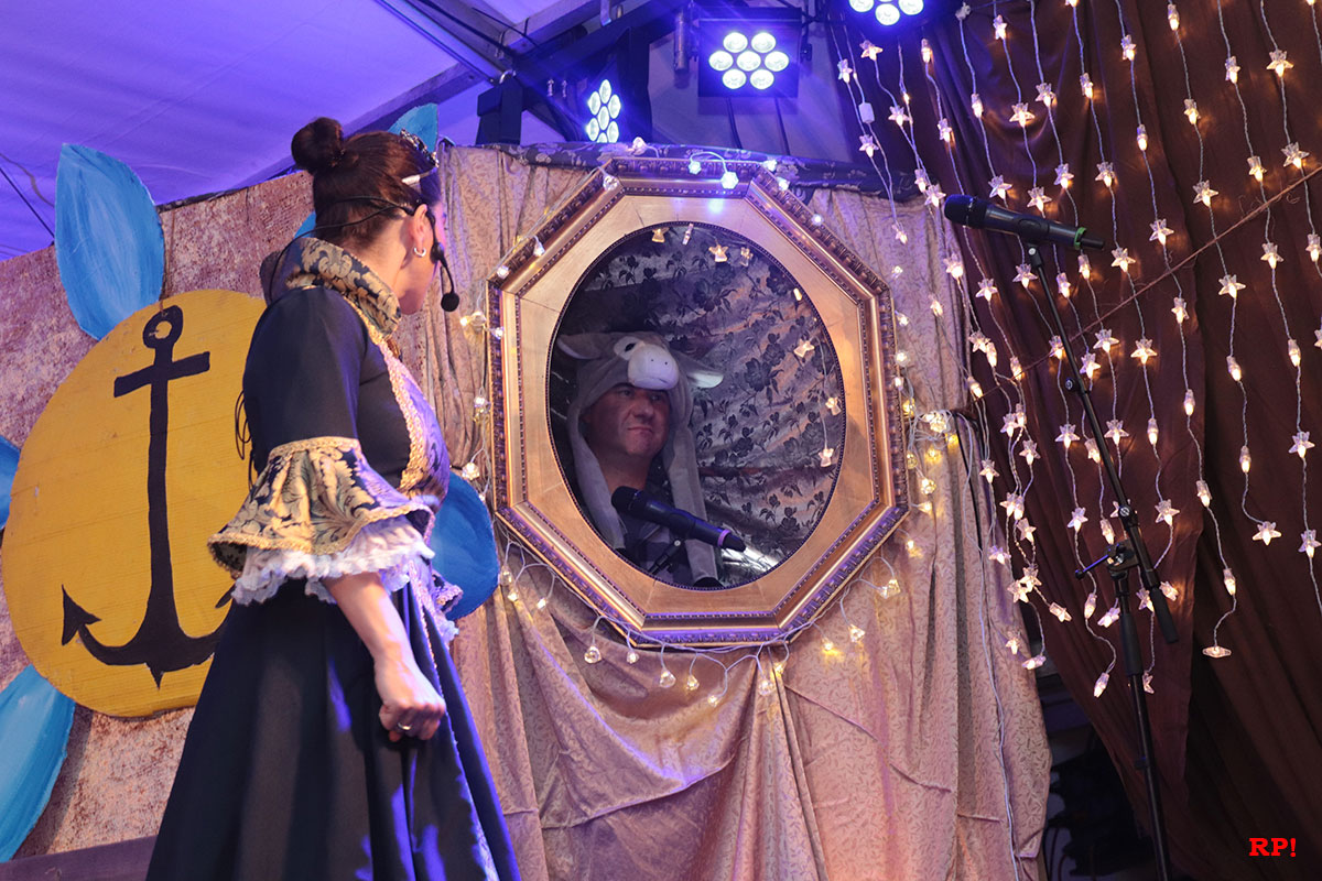 Eine turbulente Tragikkomödie entspann sich, bei der die blaugewandete Königin keine Gelegenheit ausließ, sich ihre vermeintliche Schönheit von einem mysteriösen, weissagenden Eselsspiegel (Jochen Zaich) bestätigen zu lassen. Wie Schatthäuser Eselsspiegel aber so sind – wegen seiner Ehrlichkeit musste er doch viele fiese Knuffe hinnehmen. Je ehrlicher er war, desto schlimmer. Allerdings muss man der Ehrlichkeit halber auch sagen, dass die Königin wegen ihrer Herkunft – die von allen Anwesenden intensiv und, hie und da, über Genüge betont wurde – keinen wirklich angenehmen Stand hatte. Der einzige Hoffnungsschimmer – schließlich hat der Ort das Symbol der Hoffnung im Wappen – war bisweilen, dass Lutz I. schon immer nach dem Motto „Make Love not War“ gelebt hatte, auch wenn ihm bewusst war, dass „Frauen gleich ihren Spaß wollen, wenn man sie mal loslässt.“