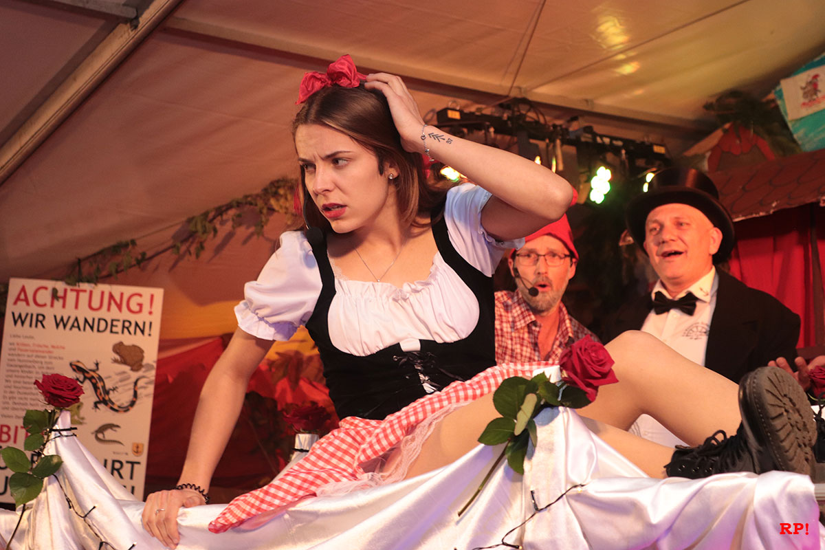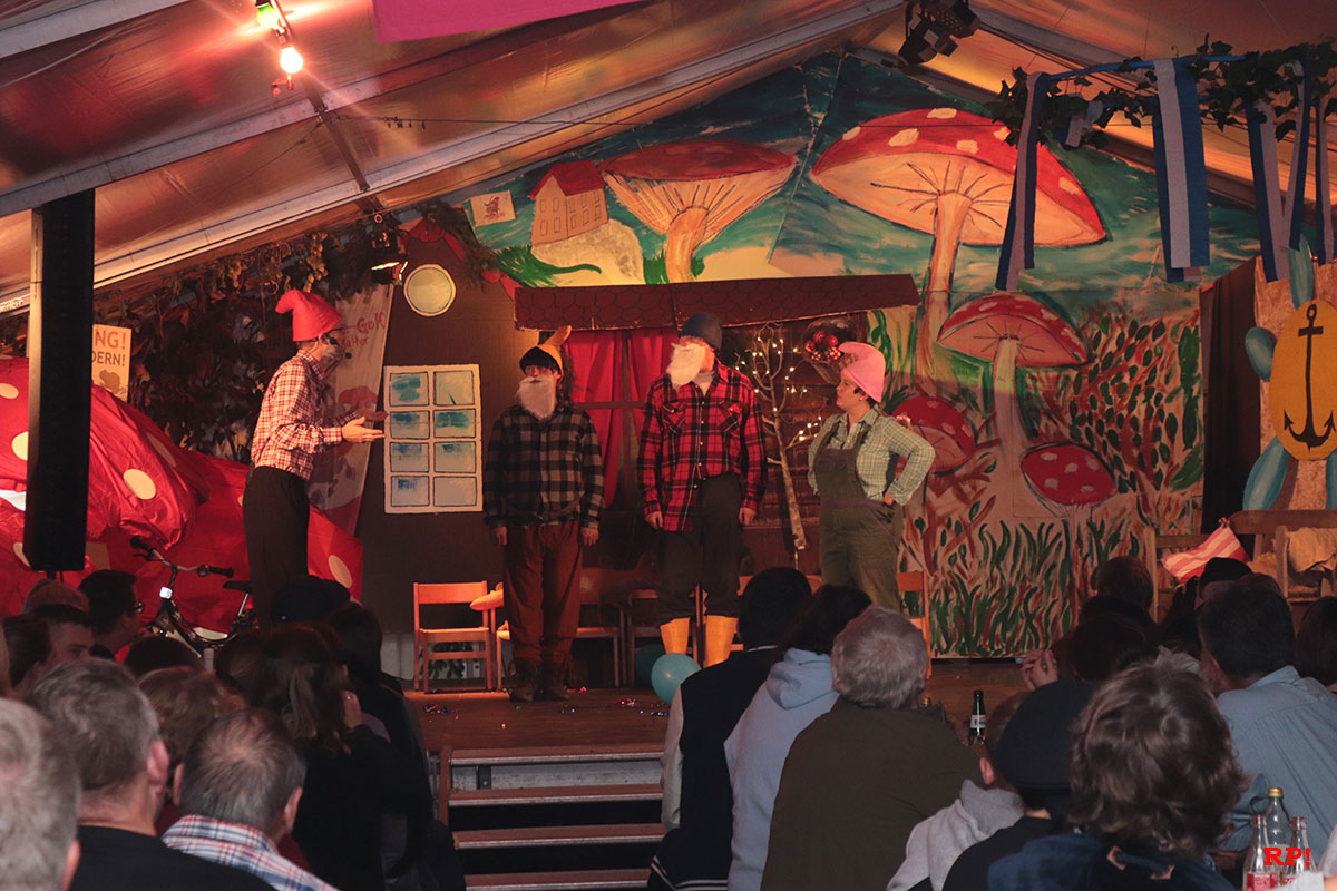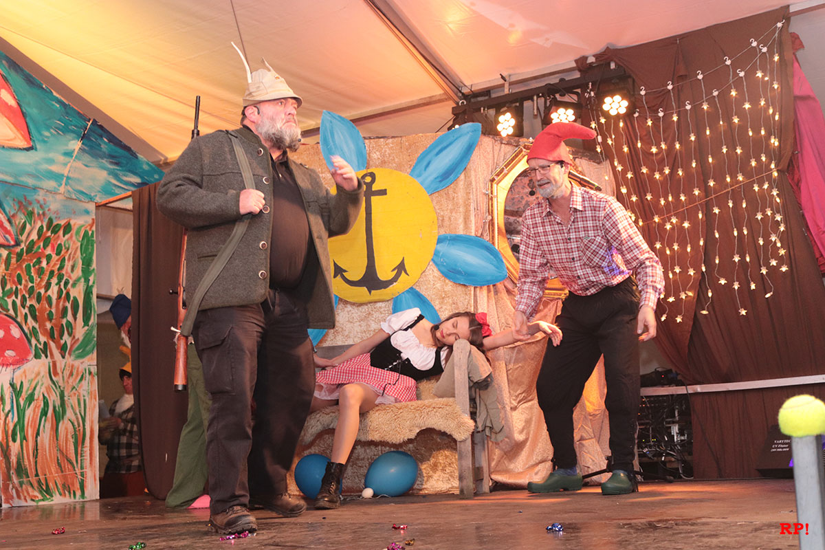 Man ahnt es fast schon – so friedlich konnte es nicht lange bleiben: Wie zum Ausgleich donnerte dann montags gleich zu Beginn der Kerweshow Zwerg Pimpel (Patrick Schulz) „Schatthause bleibt Schatthause! Baiadlahawwe do nix zu suche!“ von der Bühne. Man muss dem Showleiter und Chef der Schatthäuser Zwerge freilich zugestehen, dass er sich in einem akuten Zustand von nervenzerreißendem Endstress befand. Warum? Nun ja, Schatthausens König, Lutz, der Erste, hatte sich bei einer Auswärtsmission ausgerechnet eine Dame aus Baiertal (Beatrice Rebholz) angelacht und diese in einem Anfall von amourösen Halluzinationen zur neuen Königin erkoren: Königin über Baiertal UND Schatthausen. Nicht nur Pimpel, auch der Jäger aus Kurpfalz (Joachim Kaiser), der schwerbewaffnet die schicksalsschwangere Nachricht überbringen musste, sowie Hilda, die aus Sachsen importierte Zwergendame mit der rosa Zipfelmütze (Tamara Schmidt), waren verzweifelt und fassungslos angesichts dieser hochnäsigen Bedrohung aus dem wildwasserdurchspülten Westen, die es mit allen Mitteln abzuwehren galt. Doch zunächst ging dies nicht von allein, schier unüberbrückbare Schwierigkeiten tauchten auf.