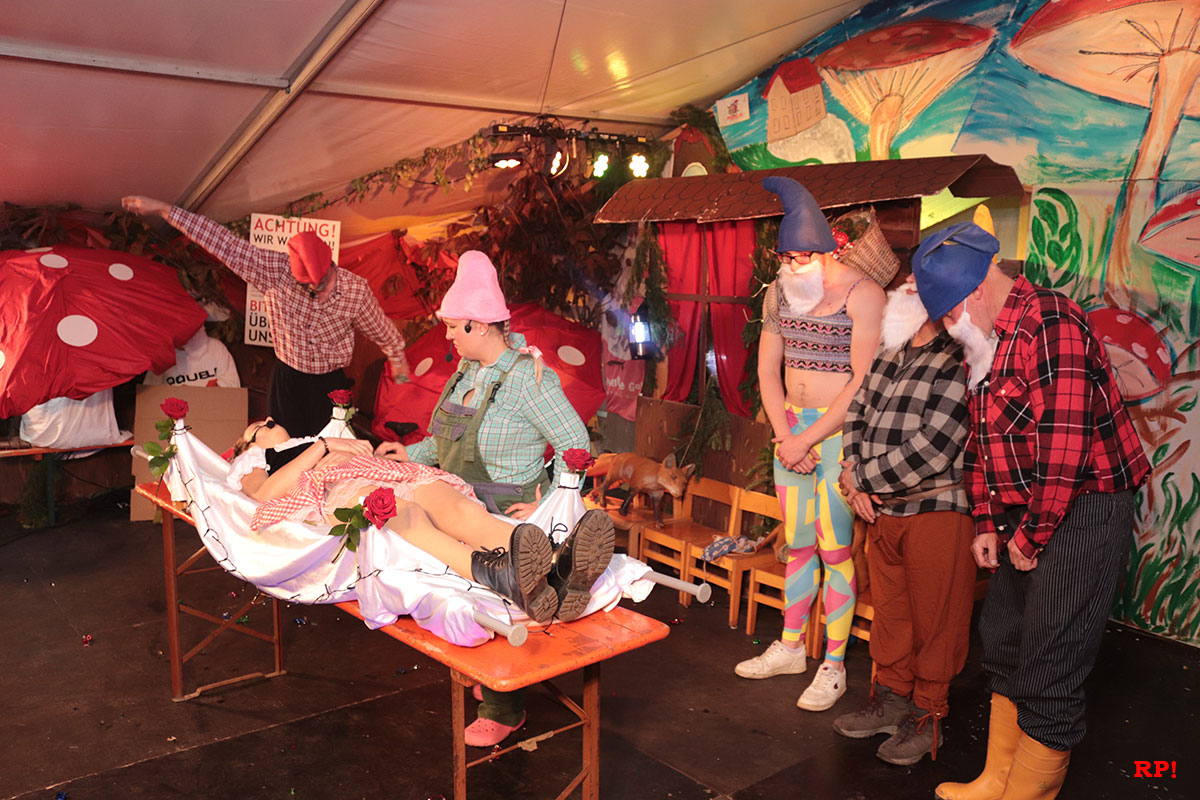 Und wer könnte da besser für Wunder sorgen und das Schneewittchen wachküssen als der Kerwevereins-Vorstand? Tatsächlich! Ulvi Bern stellte sich für dieses schwere Amt ohne Zaudern und mit den historischen Worten „Alla hopp, warum donnned? Do gibt’s weitaus hässlischereFraue!“ zur Verfügung. Gesagt, getan! Schneewittchen lächelte, öffnete tatsächlich die Augen, lebte wieder und sprach: „Hi mitnonna! ÄnSchatthauseischheit Kerwe!“ Überglücklich beschlossen alle, auch die vielen tollen Akteure der diversen Showeinlagen, dieses einzigartige Wunder ausgiebig in der Kerwebar zu feiern. Und wenn sie nicht gestorben sind, dann feiern sie auch nächstes Jahr wieder!