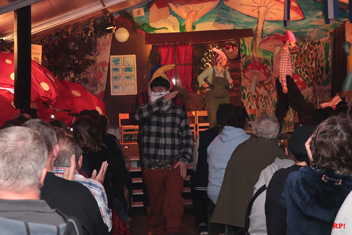 Wie vom Donner gerührt sank sie mausetot auf die zufällig in der Nähe stehende Bank mit Lammfell und Kissen, die zum Glück Harry Schilles beim Bühnenbildnern abgestellt hatte, nieder. Groß war das Wehgeschrei – so groß, dass es Tom Pfeifer und Hubert Schramm fast die Ton- und Lichtregler aus der Hand schlug und dass selbst Souffleuse Charlotte Schilles hier und da beruhigend eingreifen musste. Pimpel, Hilda, der Jäger und all die anderen zahlreichen Beteiligten – außer der Königin natürlich, die komischerweise genau wusste, was mit Schneewittchen los war – weinten, heulten und wehklagten zum Steinerweichen. Grimmsseidank kam aber Zwergendame Hilda die rettende Idee: Die Idee nämlich, dass in Märchen – und das war es ja – auch Wunder geschehen können. Besonders auf der Schatthäuser Kerwe.