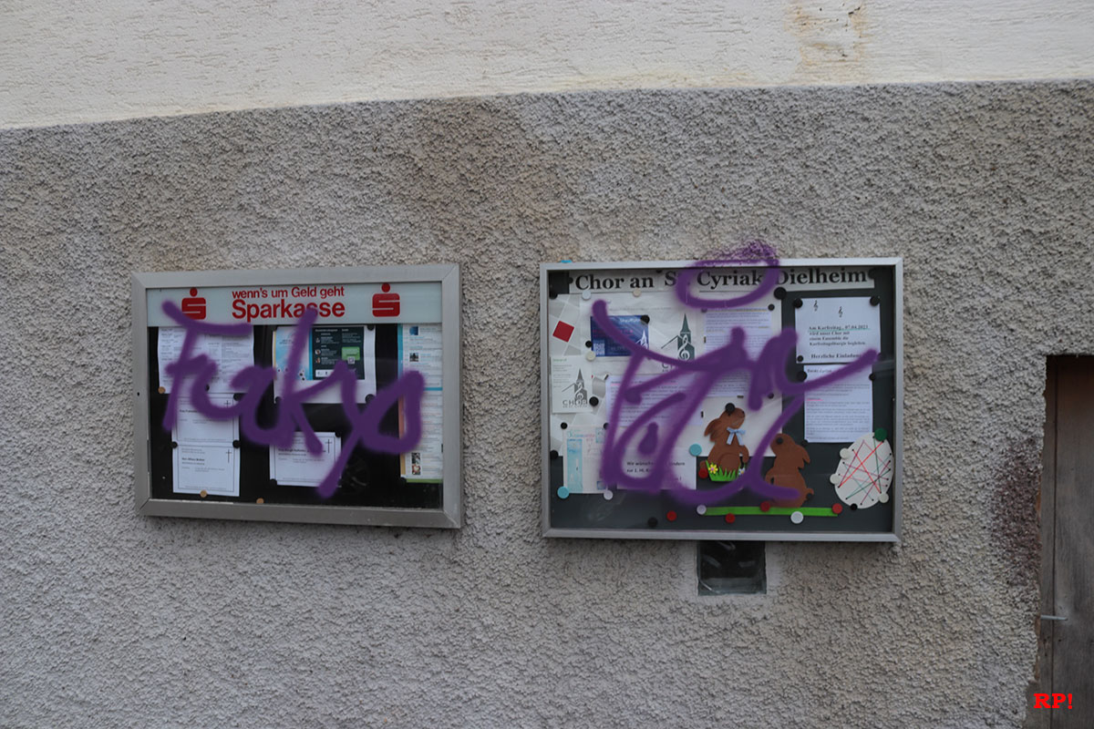 Selbst vor den Schaukästen der Kirche hat man nicht haltgemacht. Die Dielheimer Bürger, die unserer Reporter antraf, sind allesamt schockiert über das Ausmaß der Sachbeschädigung. Sie fordern harte Strafen für Täter.