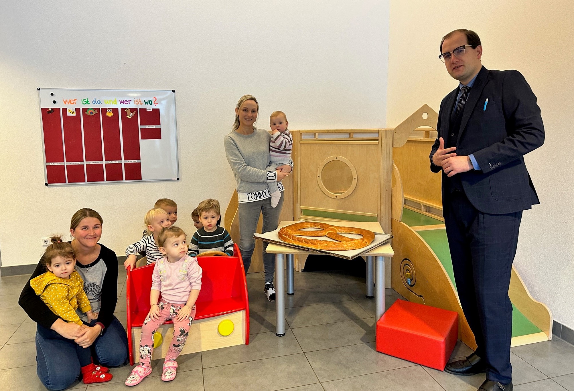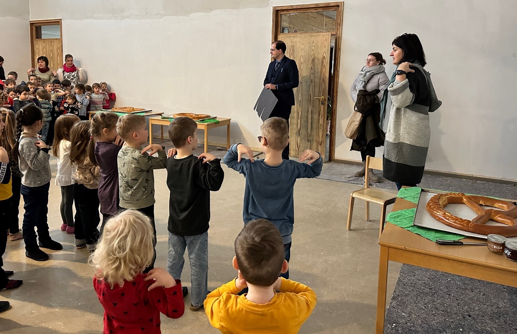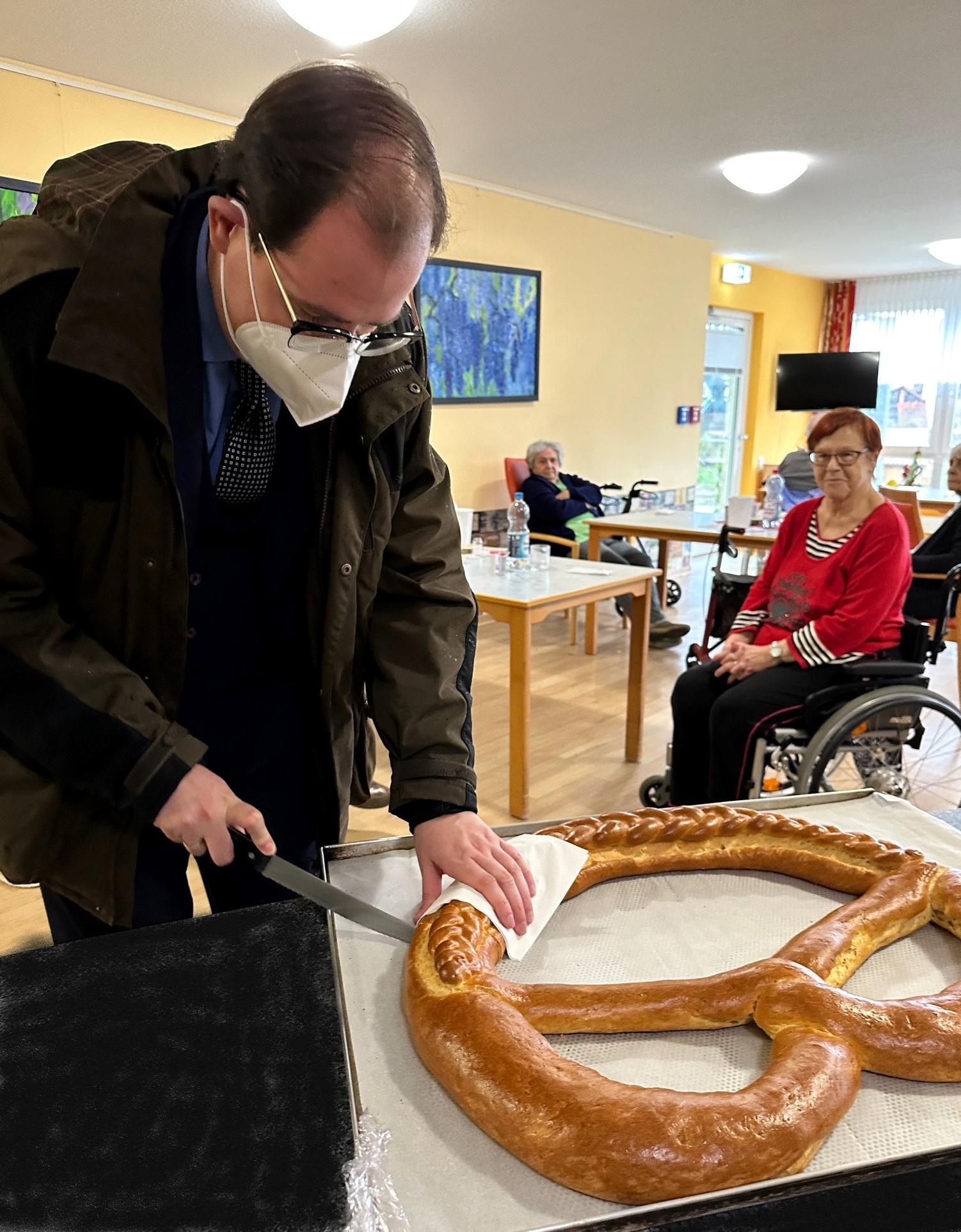 Als Dankeschön wünschten die Kinder dem Bürgermeister ganz viel Freude, Gesundheit, Liebe und Kuscheltiere für das Jahr 2023. Danach wurden noch ein paar Lieder gesungen und ein Segen gesprochen. Zum Abschluss erhielten die Seniorinnen und Senioren der Tagespflege und des Pflegeheims eine Brezel welche ebenso gemeinsam mit Herrn Borho angeschnitten wurde. Insgesamt sind zwölf große Neujahrsbrezeln verteilt worden.