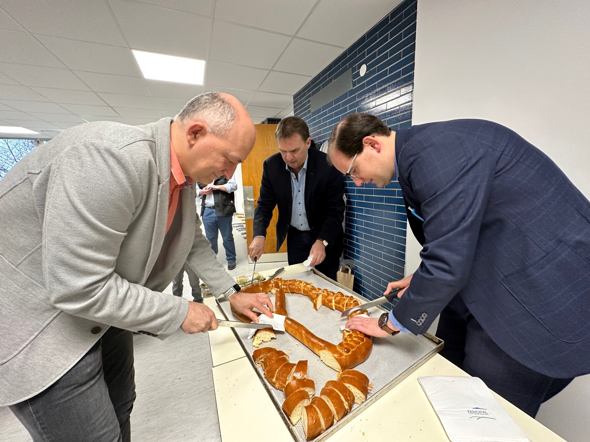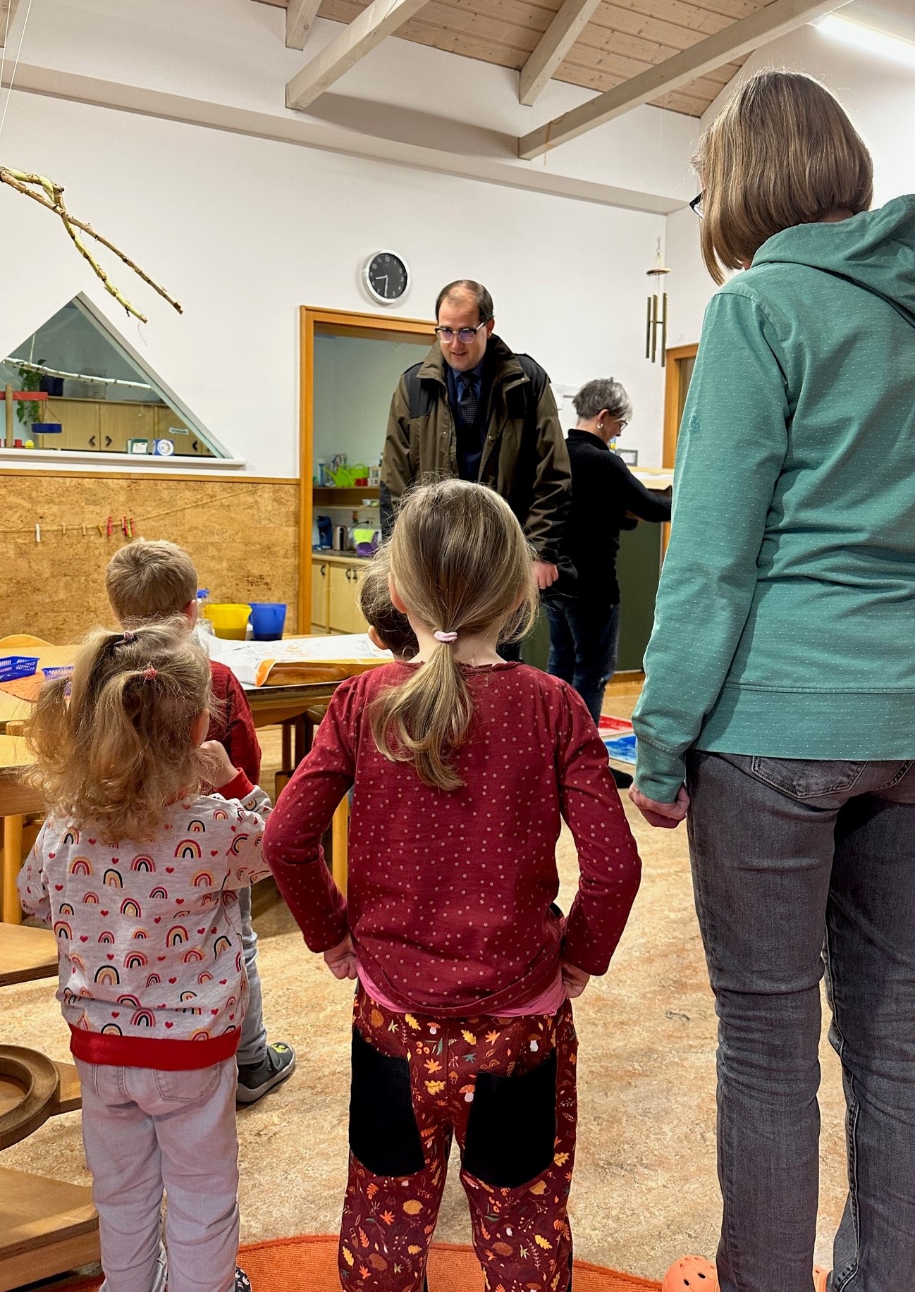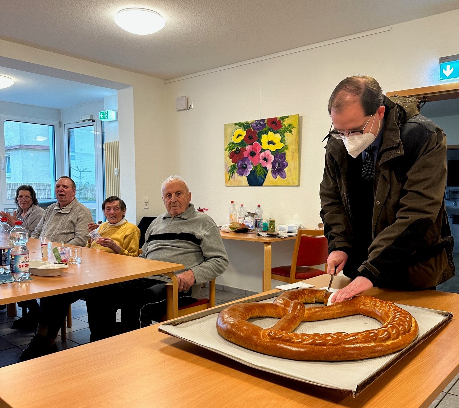 Als Dankeschön wünschten die Kinder dem Bürgermeister ganz viel Freude, Gesundheit, Liebe und Kuscheltiere für das Jahr 2023. Danach wurden noch ein paar Lieder gesungen und ein Segen gesprochen. Zum Abschluss erhielten die Seniorinnen und Senioren der Tagespflege und des Pflegeheims eine Brezel welche ebenso gemeinsam mit Herrn Borho angeschnitten wurde. Insgesamt sind zwölf große Neujahrsbrezeln verteilt worden.